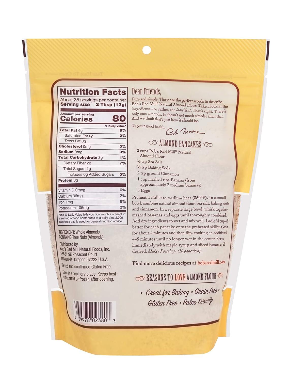 Share good ingredients for all! Bob’s Red Mill Natural Almond Flour is made from premium whole California-grown almonds, finely ground to create a superior gluten free, low-carb flour. Perfect for paleo, keto and grain free baking, it adds a rich, buttery flavor and moist texture to your favorite recipes. Use as a breading for meats and vegetables or to replace breadcrumbs in meatballs. Expertly milled for homemade perfection—every time—this premium gluten free flour is the ideal ingredient to share with loved ones with celiac or a gluten intolerance.