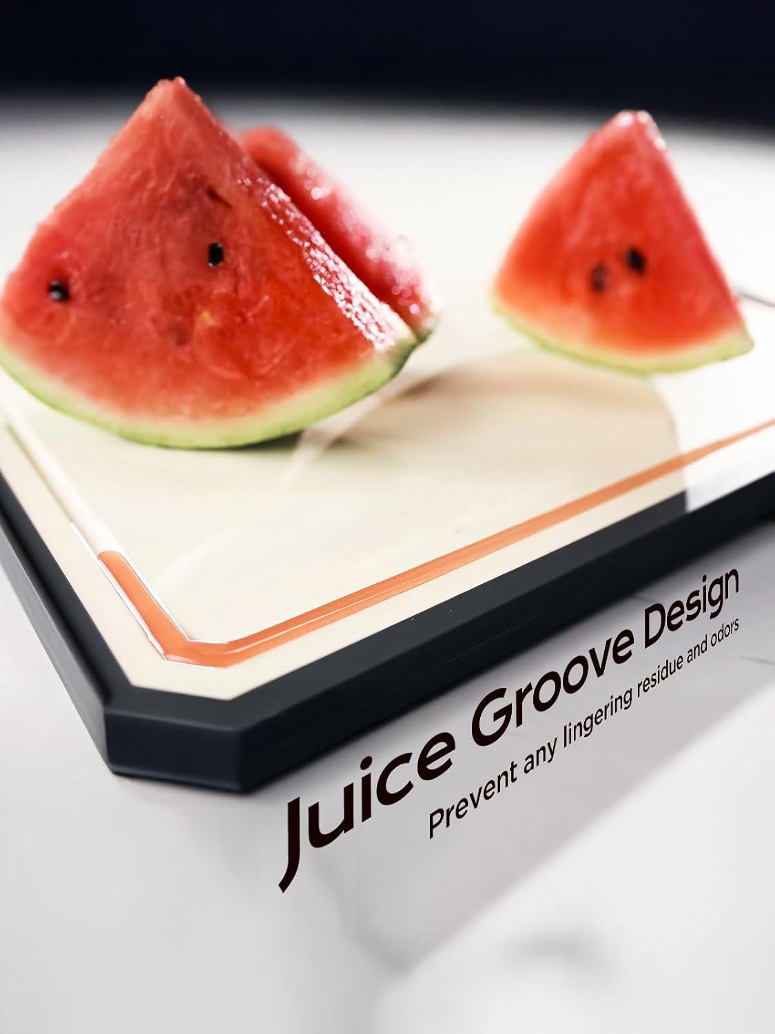 【JUICE GROOVE】With juice groove side you can easily catch any juices or liquids from meats or fruits while cutting, making this chopping board cleanup even easier.