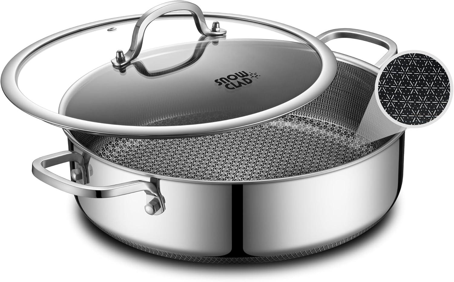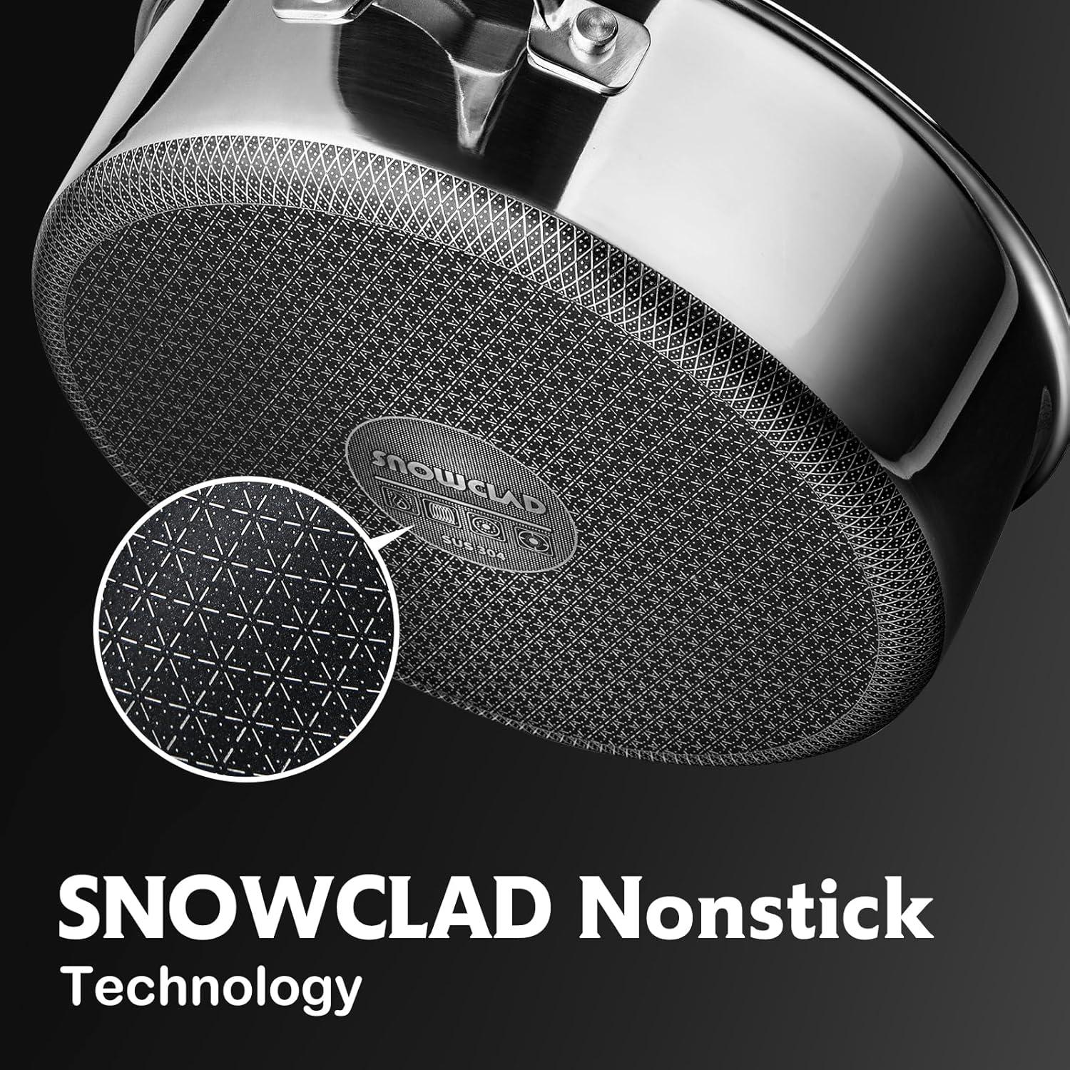 【SNOWFLAKE TECHNOLOGY】Our design is created through a laser etching process to provide both stainless steel and non stick surface. This dual surface allows to cook with less oil, grease, and butter.Our clad surface is 50% more than usual Hex surface non stick frying pans.